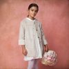 Blusa romántica blanca de bebé con puntillas. Cuello chimenea fruncido. Manga larga. Apertura posterior con botones.