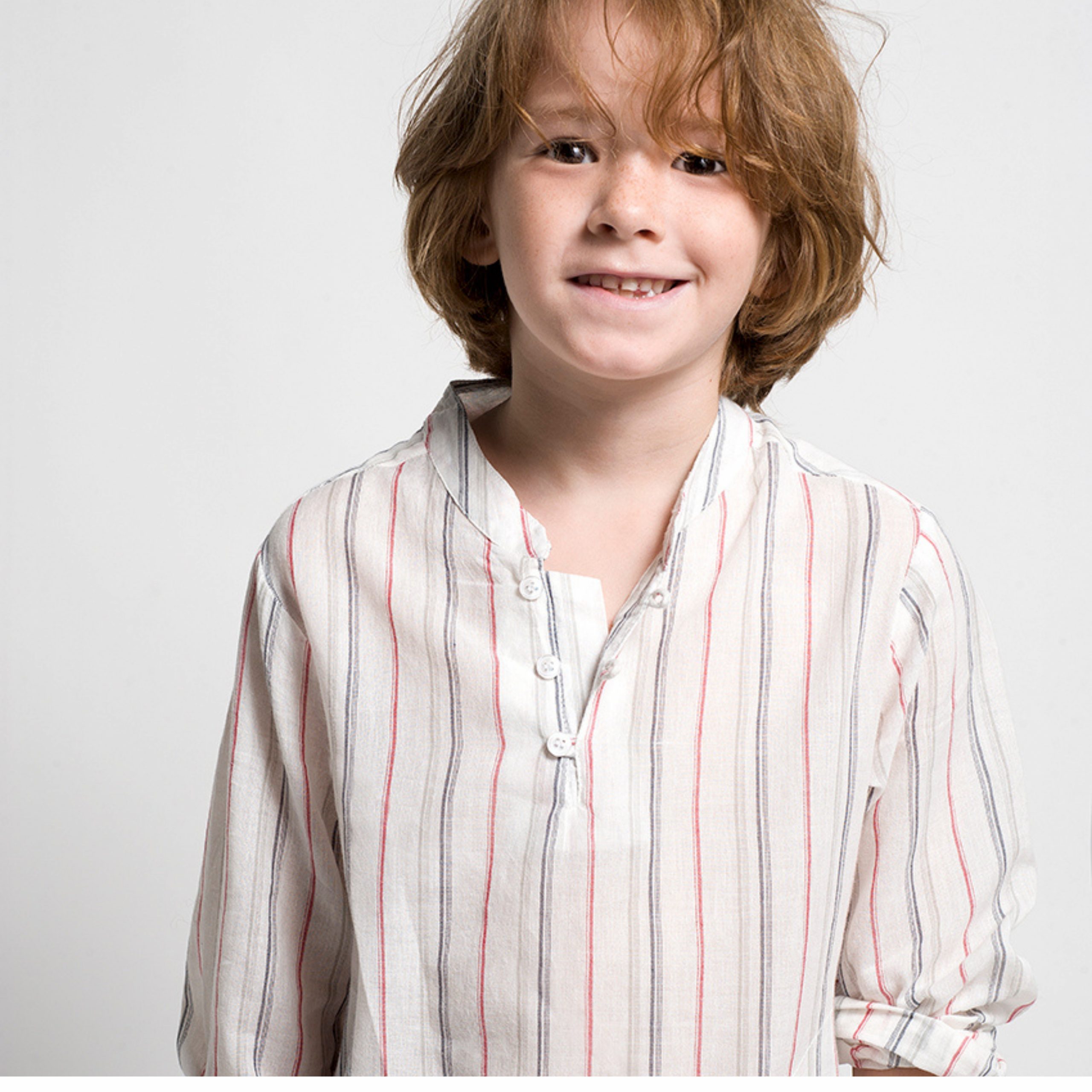Blusón de rayas blanca, con bolsillos. Fabricada en un suave algodón voile. Botones nacarados en la pechera. Cuello tipo mao. Talla pequeño para las tallas mayores, recomendamos adquirir una talla más.