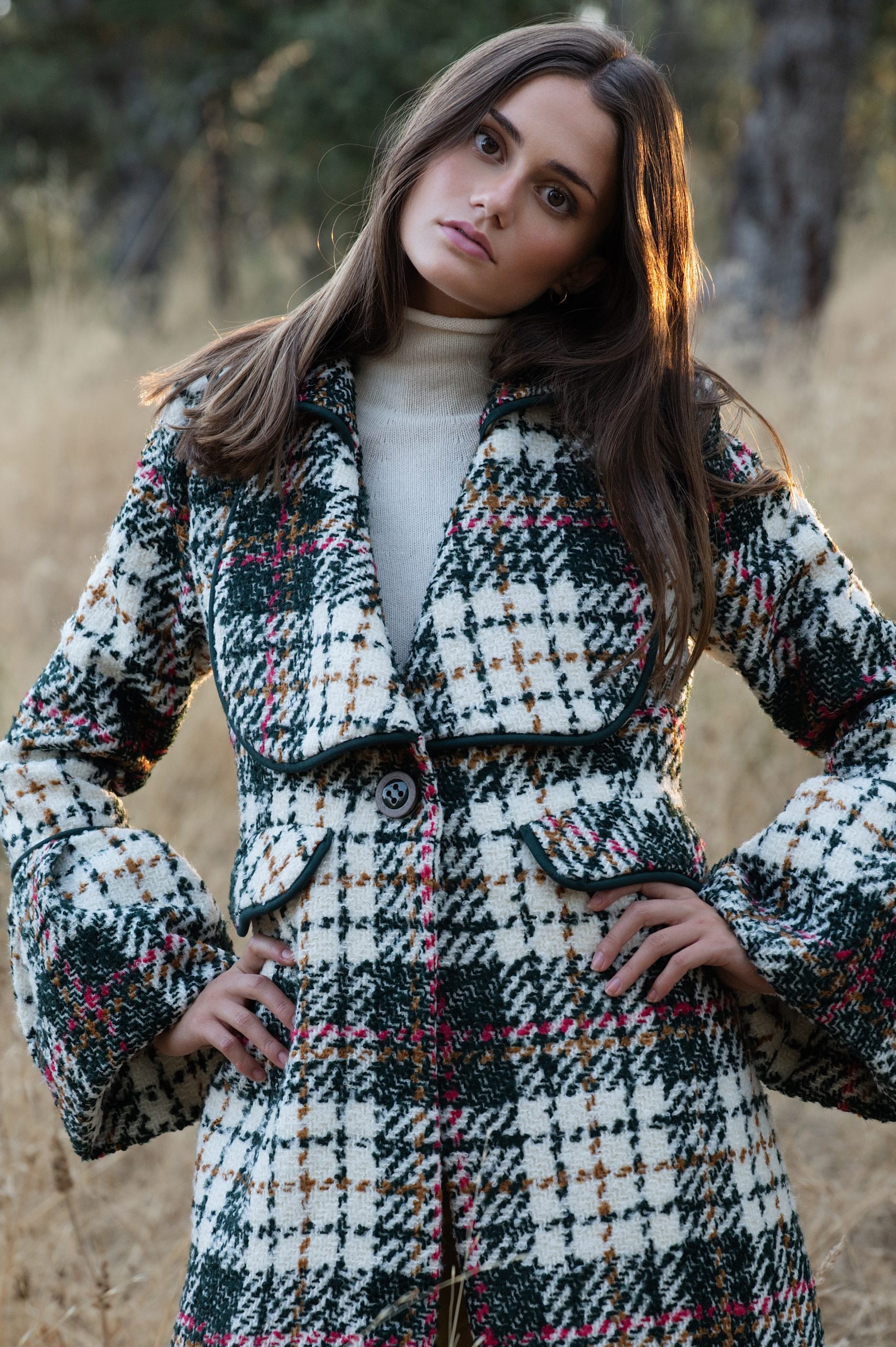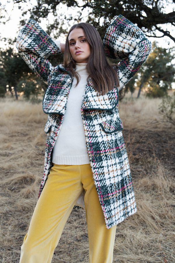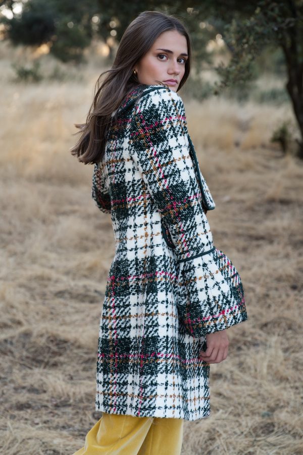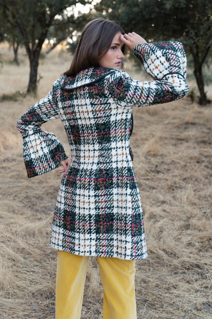 Abrigo de chica en lana de cuadros con volantes en las mangas.