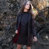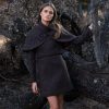 Abrigo de mujer en lana, combinable con pantalones de terciopelo amarillo o verde. Presenta volantes en las mangas.