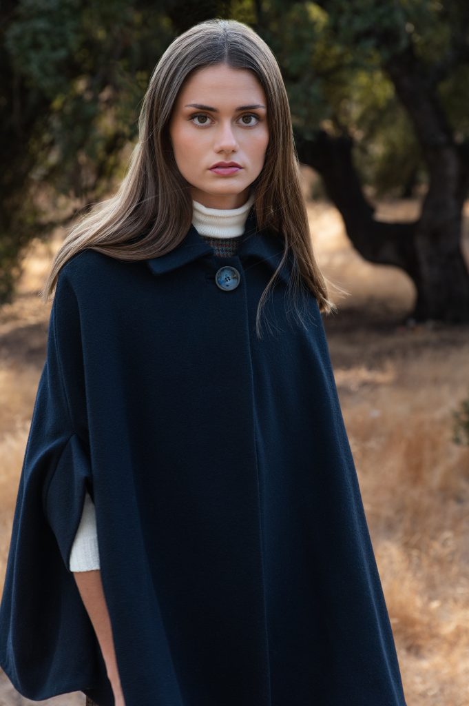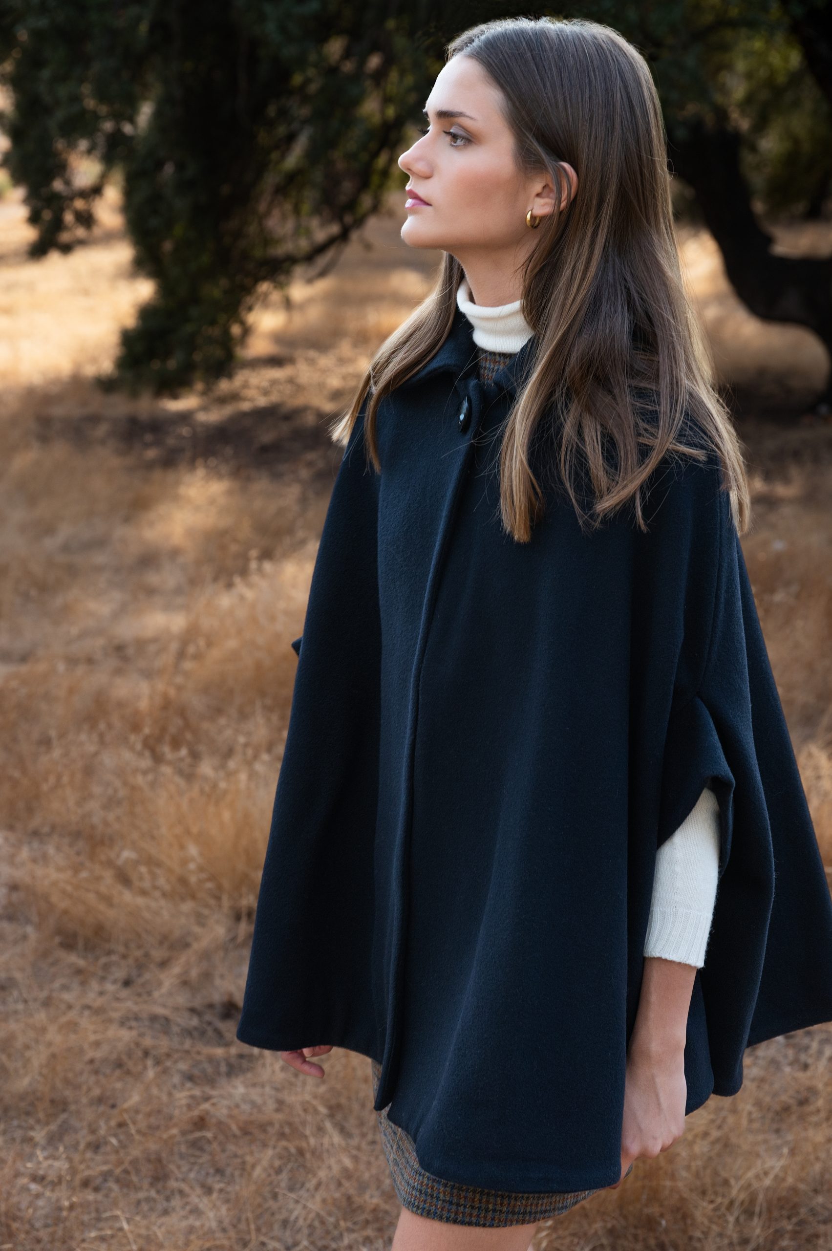 Capa de mujer en paño marino. La línea evasé  y  los grandes puños, realzan este diseño.  Te invitamos a probarla con vestido o traje.
