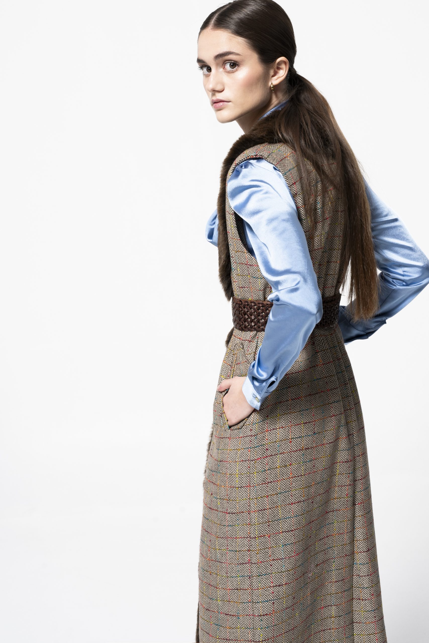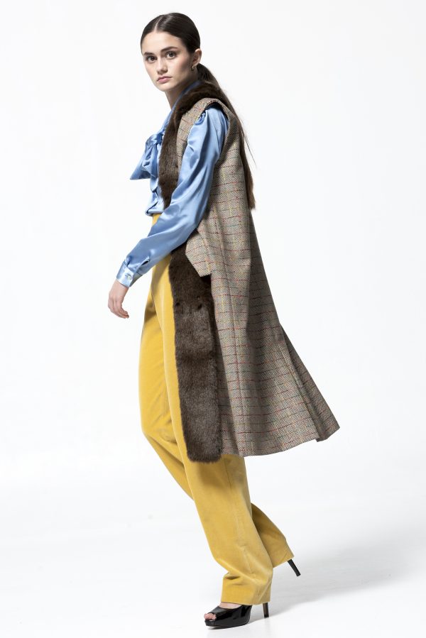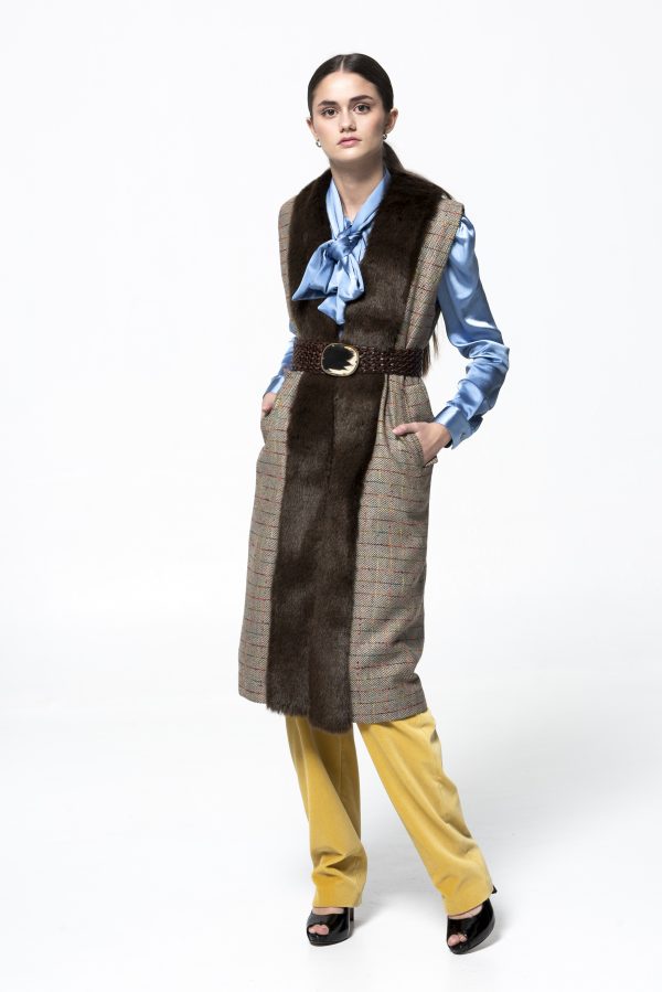 Chaleco suelto de mujer en paño con cuadros multicolor, con pelo sintético de gran calidad.  Te invitamos a probarlo en tus ocasiones más especiales.