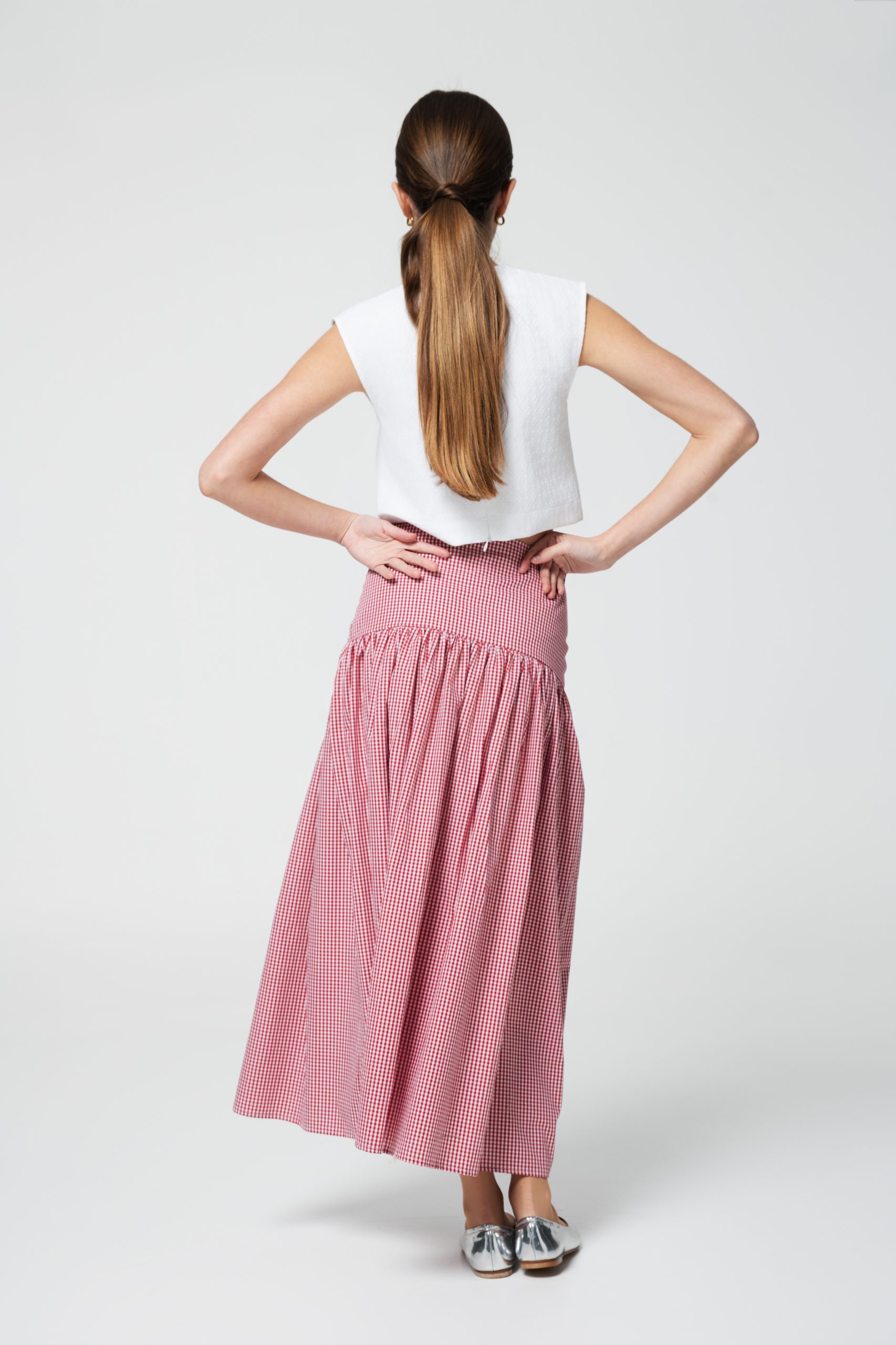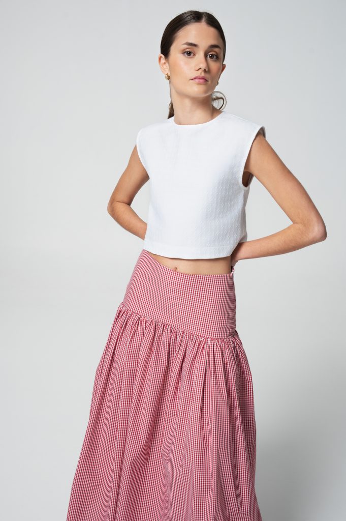 Falda de lino de flores de mujer con vuelo y bajo desigual. Te invitamos a probarla en tus ocasiones más especiales. Tela diseñada por Sainte Claire.
