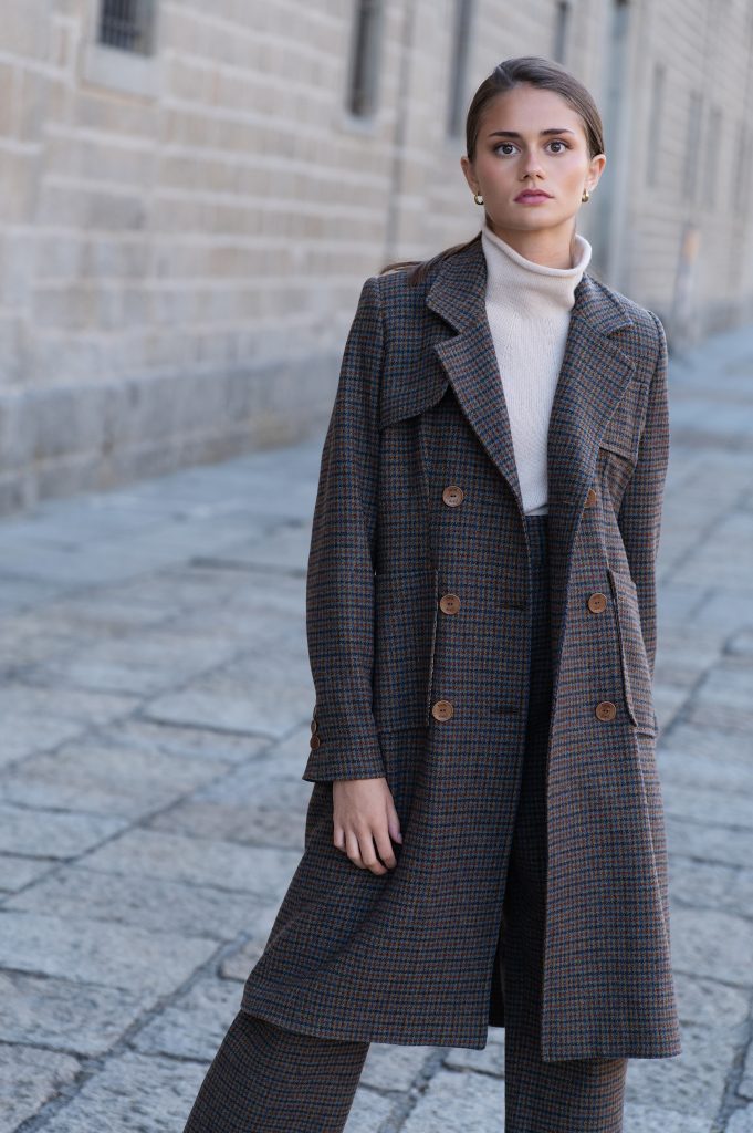 Look o conjunto de chica, de Sainte Claire, compuesto por jersey de cashemer ivory, pantalón tirantes en lana de pata de gallo y abrigo a juego estillo gabardina .