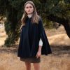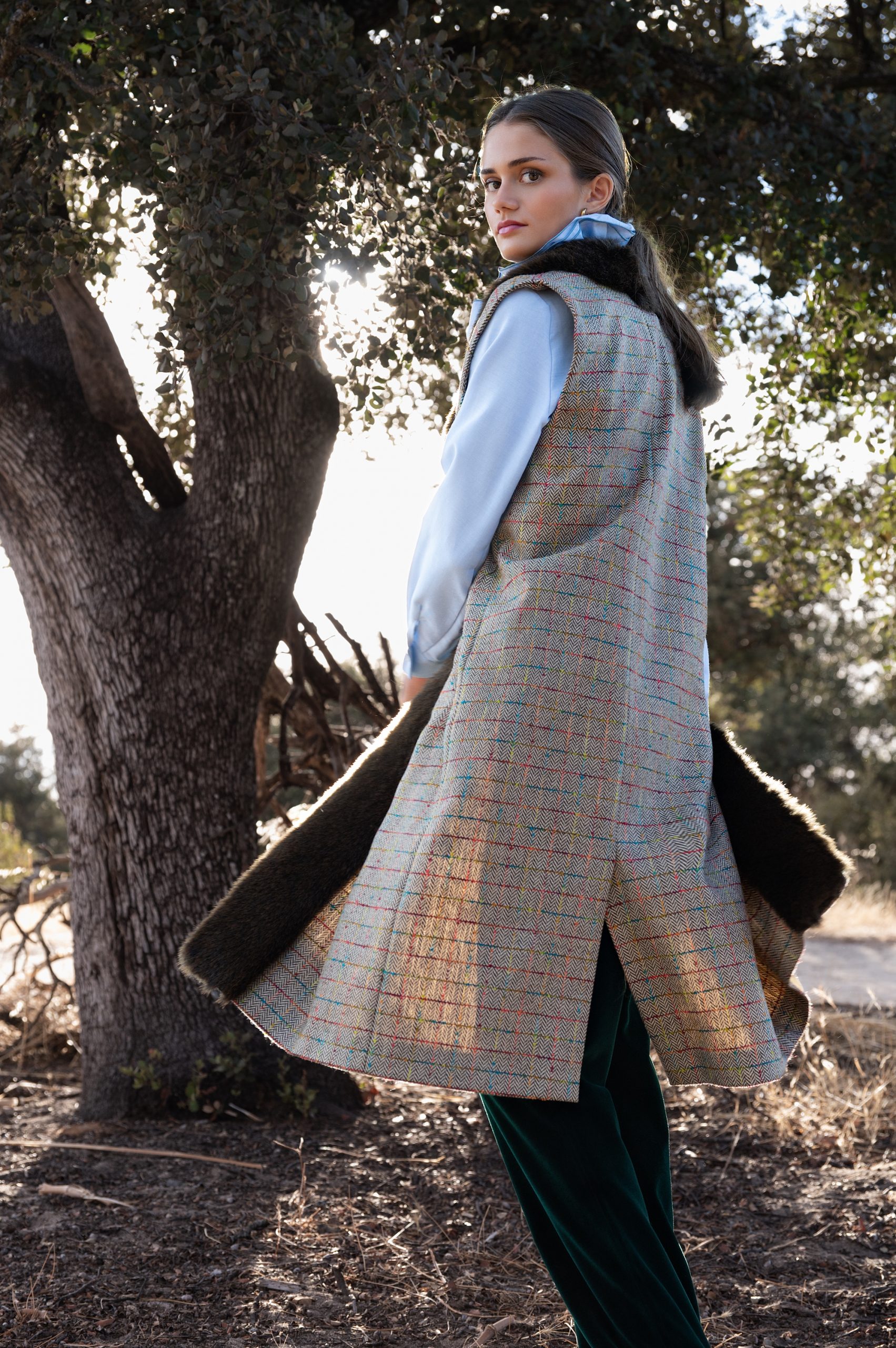 Look o conjunto de chica, de Sainte Claire, compuesto por chaleco largo, con pelo sintético de gran calidad, camisa azul oxford con lazada y pantalón de terciopelo de algodón verde de alta calidad.