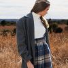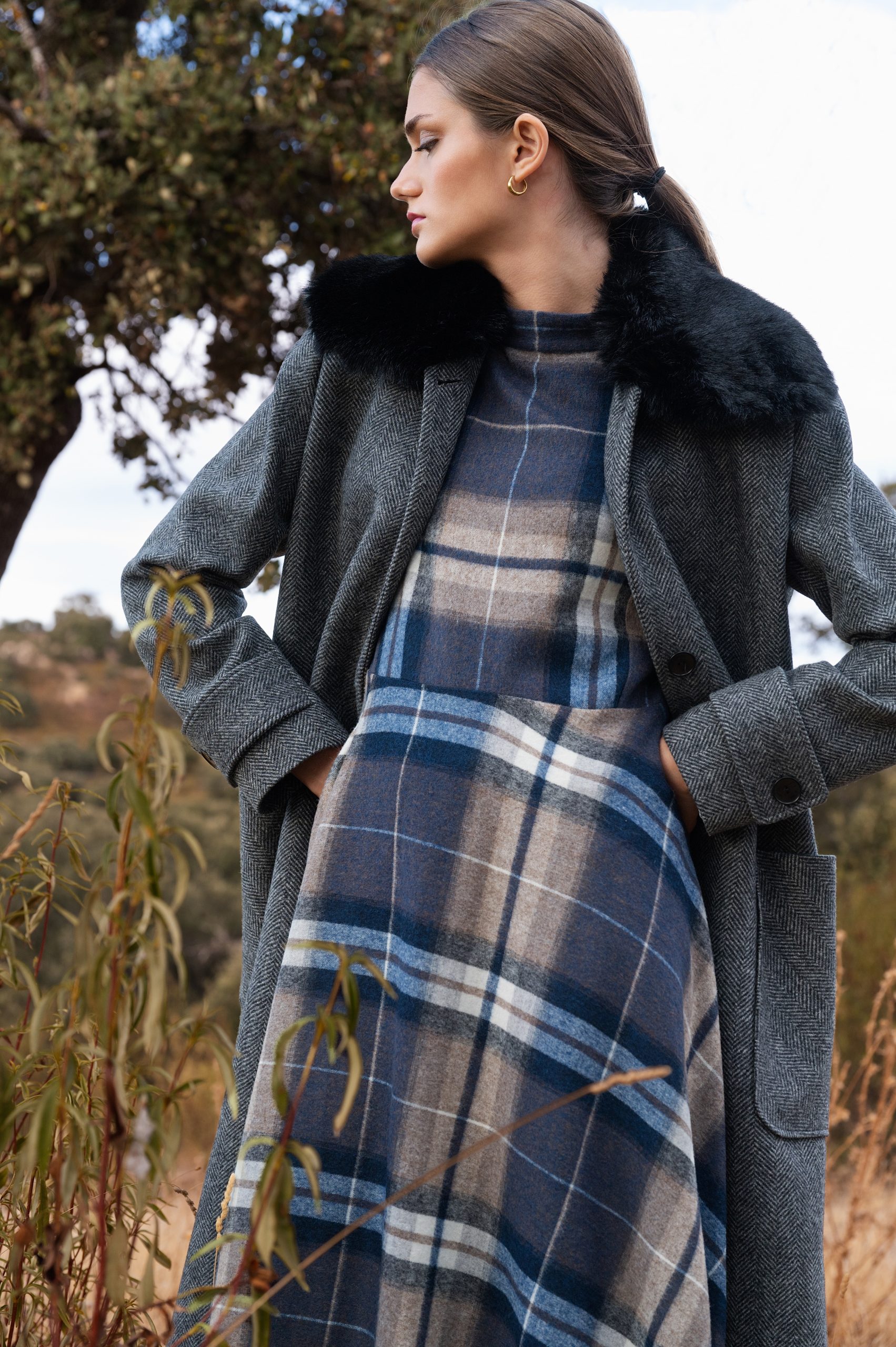 Look de chica compuesto por abrigo gris con cuello de pelo y vestido de cuadros.