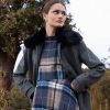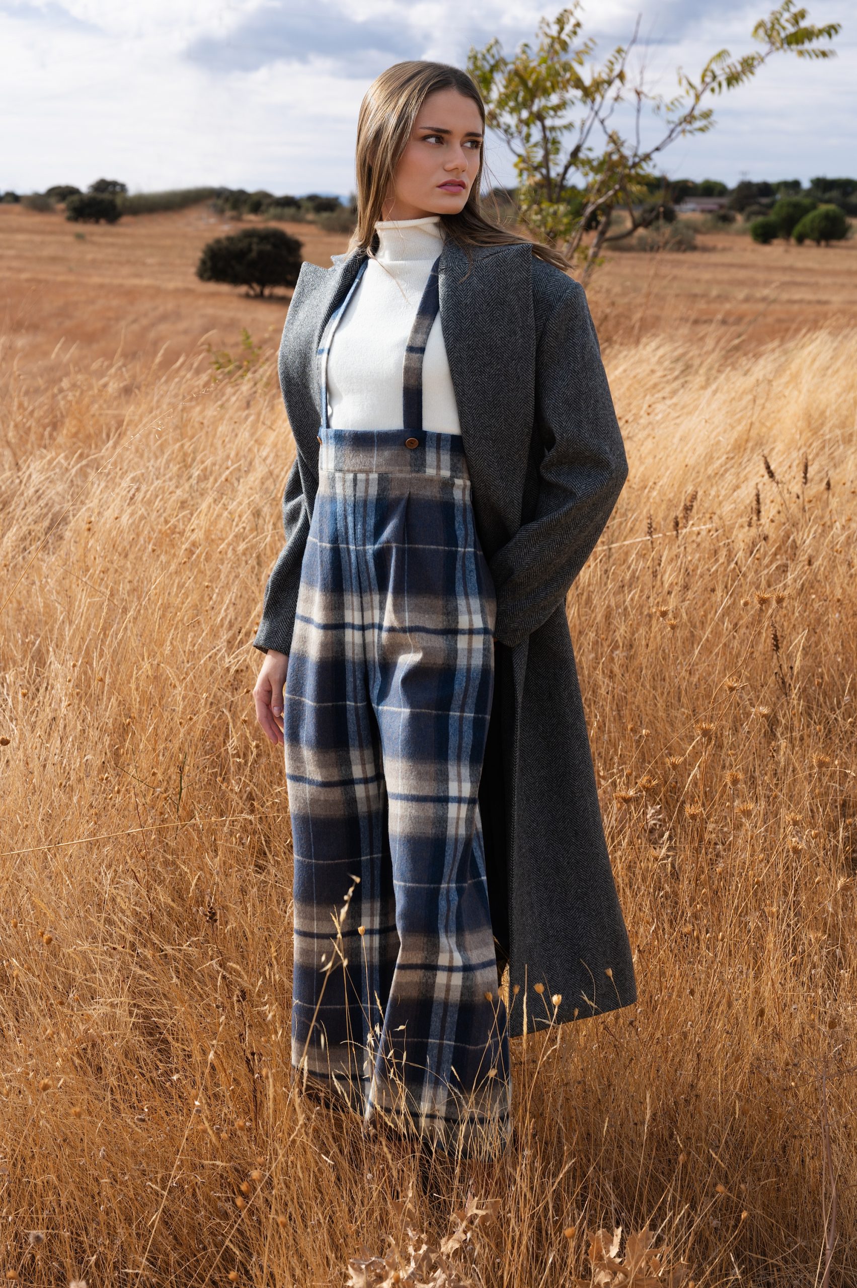Look de chica compuesto por abrigo gris con jersey de cashemere y pantalón de cuadros con tirantes.