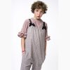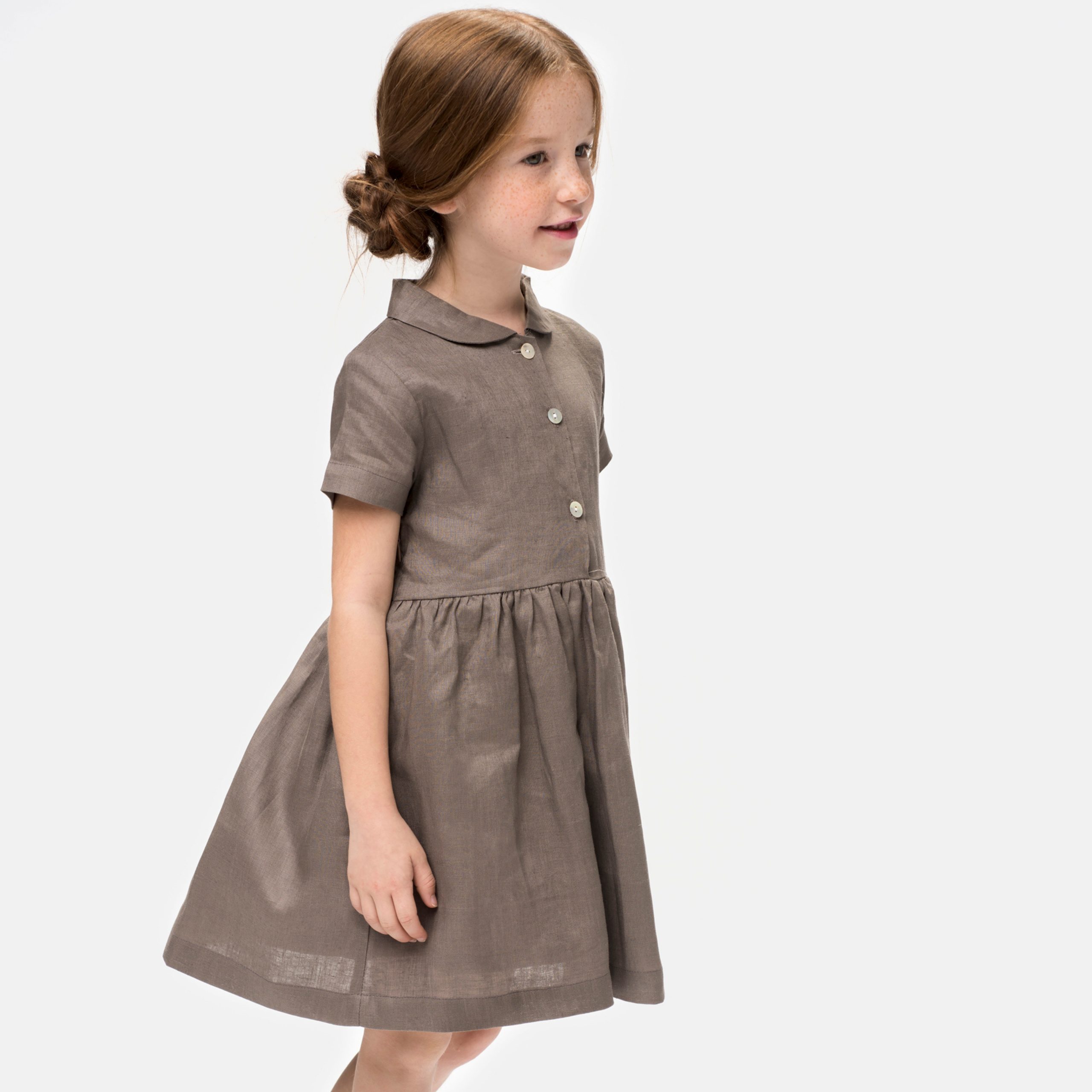 Vestido de lino en color berenjena con cuello bebé y manga corta. Se abre en la pechera con botones nacarados y tiene cremallera lateral.