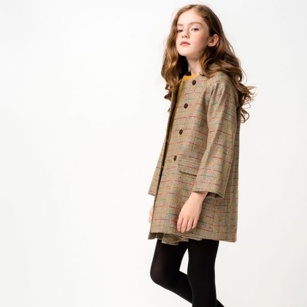 Abrigo arena con cuadros multicolor con forro gris satinado. Delantero cruzado con doble botonadura. Bolsillos en el delantero. Fabricado en España.