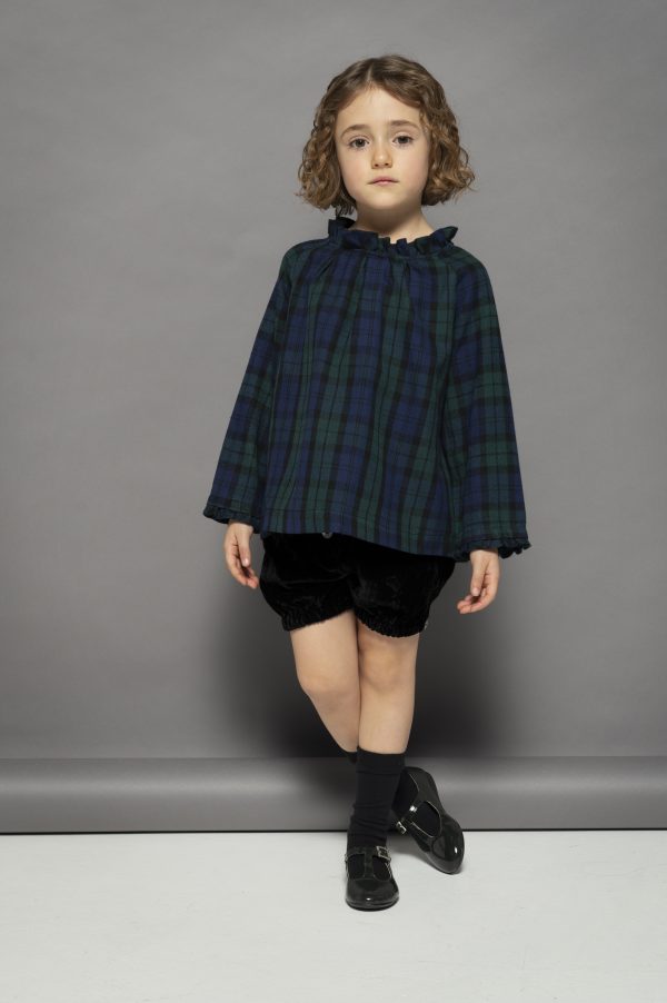 Blusa de cuadros negros, azules y verdes. Frunce en cuello y mangas y botón en la espalda.