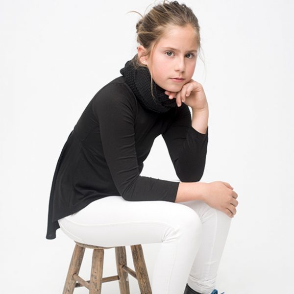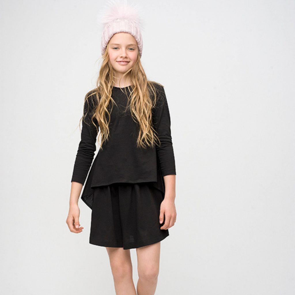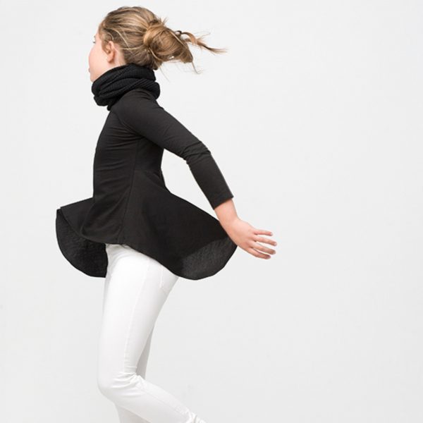 Camiseta negra de algodón pima con bajo desigual. Cuello redondo. Apertura en la espalda en forma de lágrima. Cierre con 1 botón. Fabricado en España.