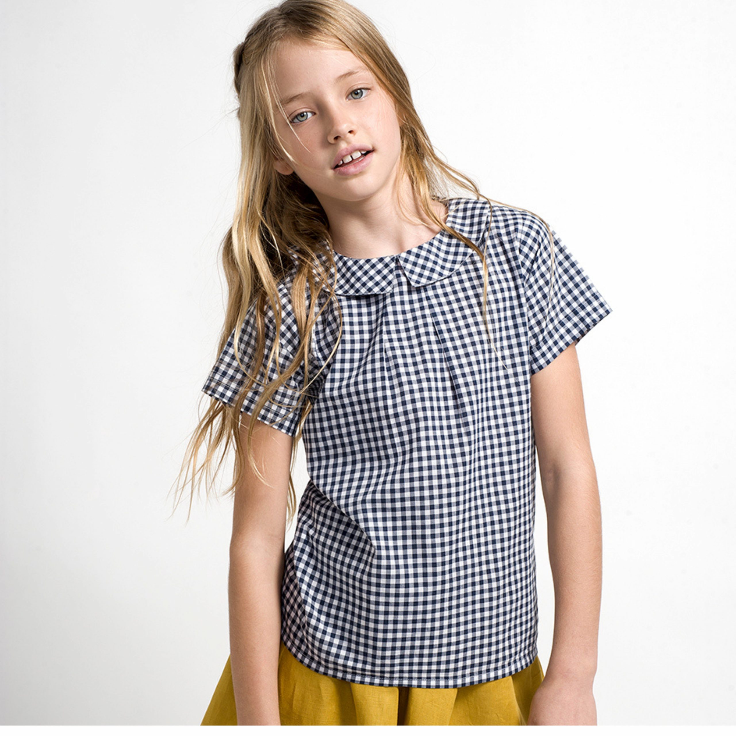Blusa de algodón vichy en tonos negros. Con cuello peter pan y manga corta. Botones en la espalda.