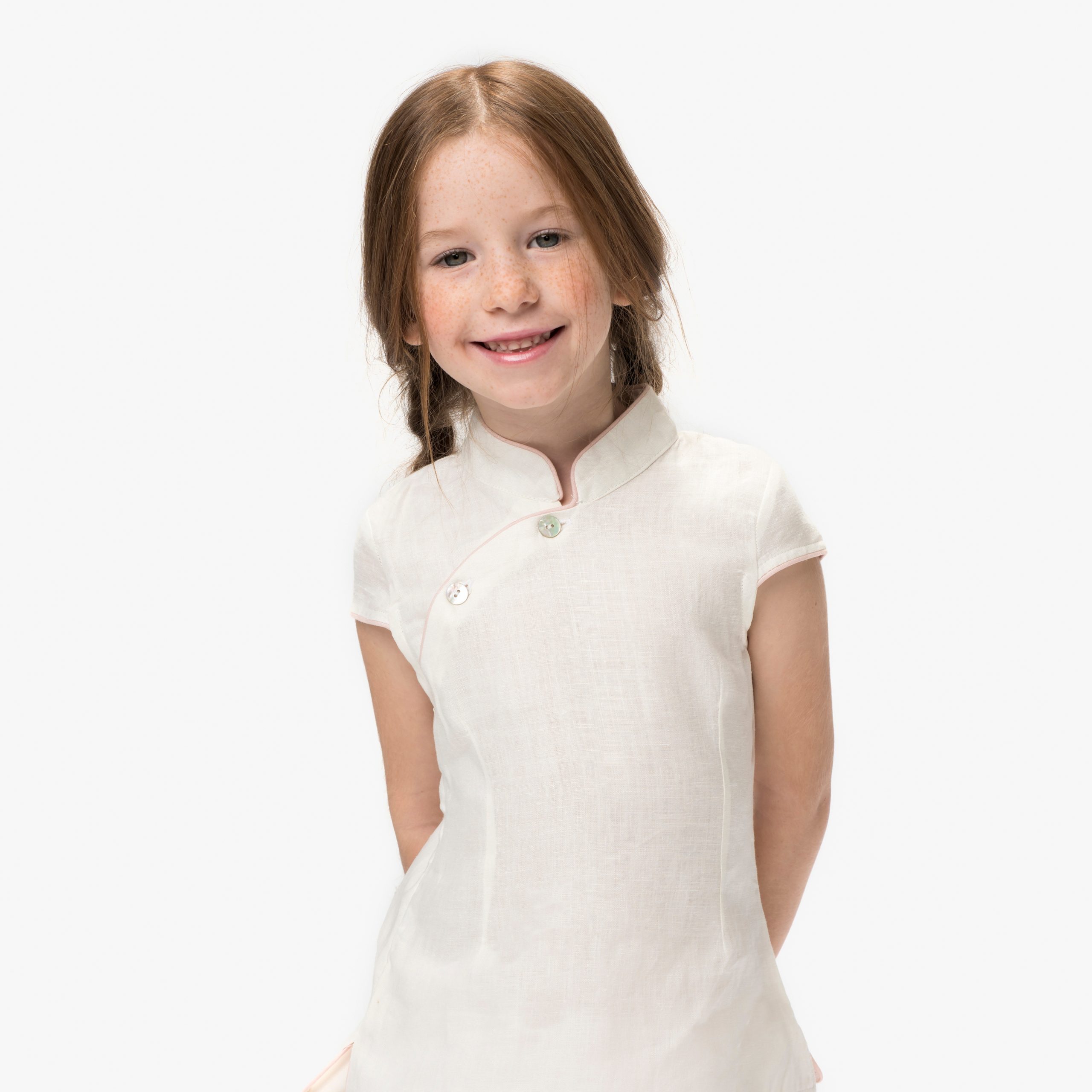 Blusa de lino con cremallera lateral de inspiración oriental, en color marfil, con filos en color rosa cuarzo. Cuello tipo mao, con abertura diagonal. Talla pequeño recomendamos adquirir una o dos tallas más.