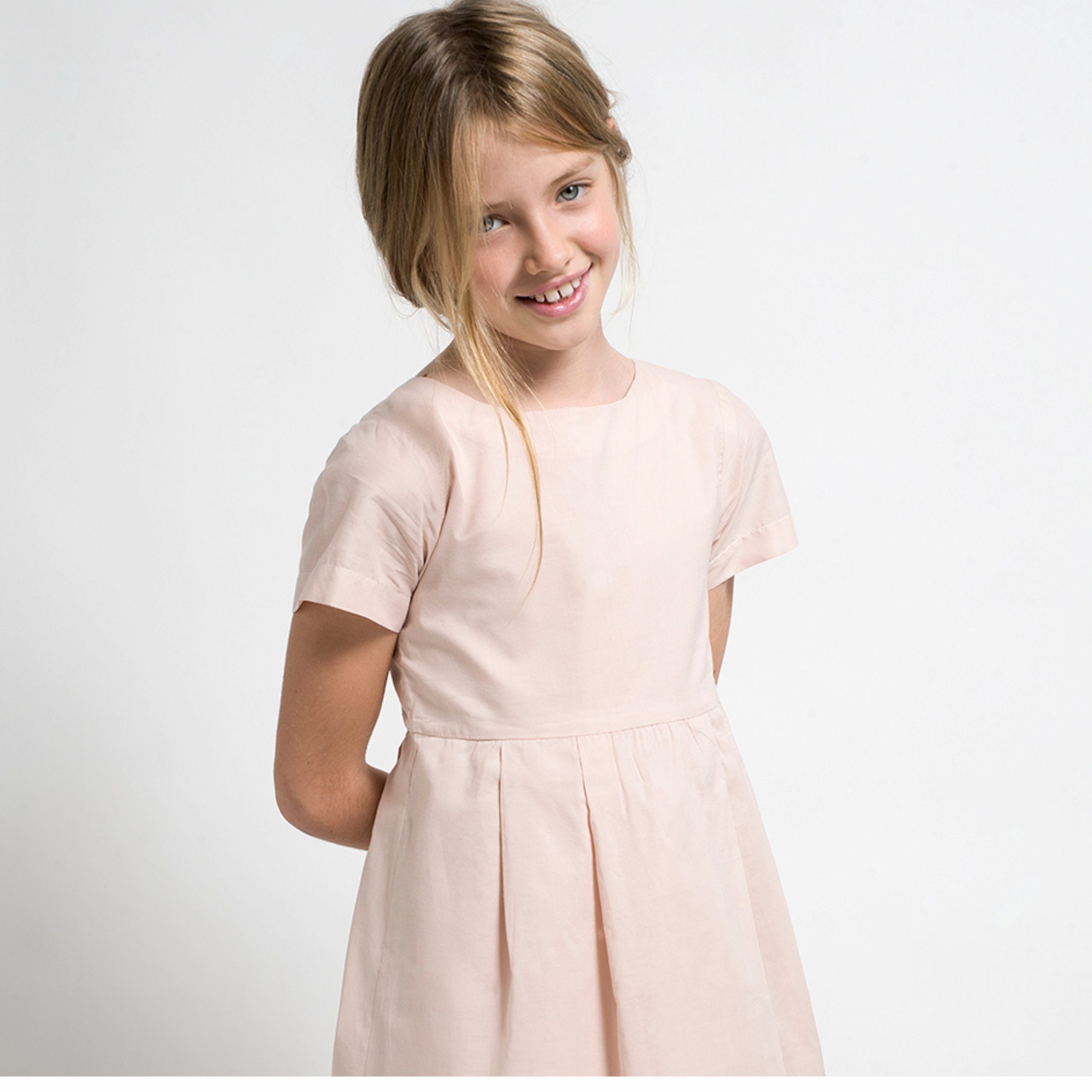 Vestido en color rosa con manga corta y encuentros en la cintura. Forrado en algodón. Botones en la espalda.